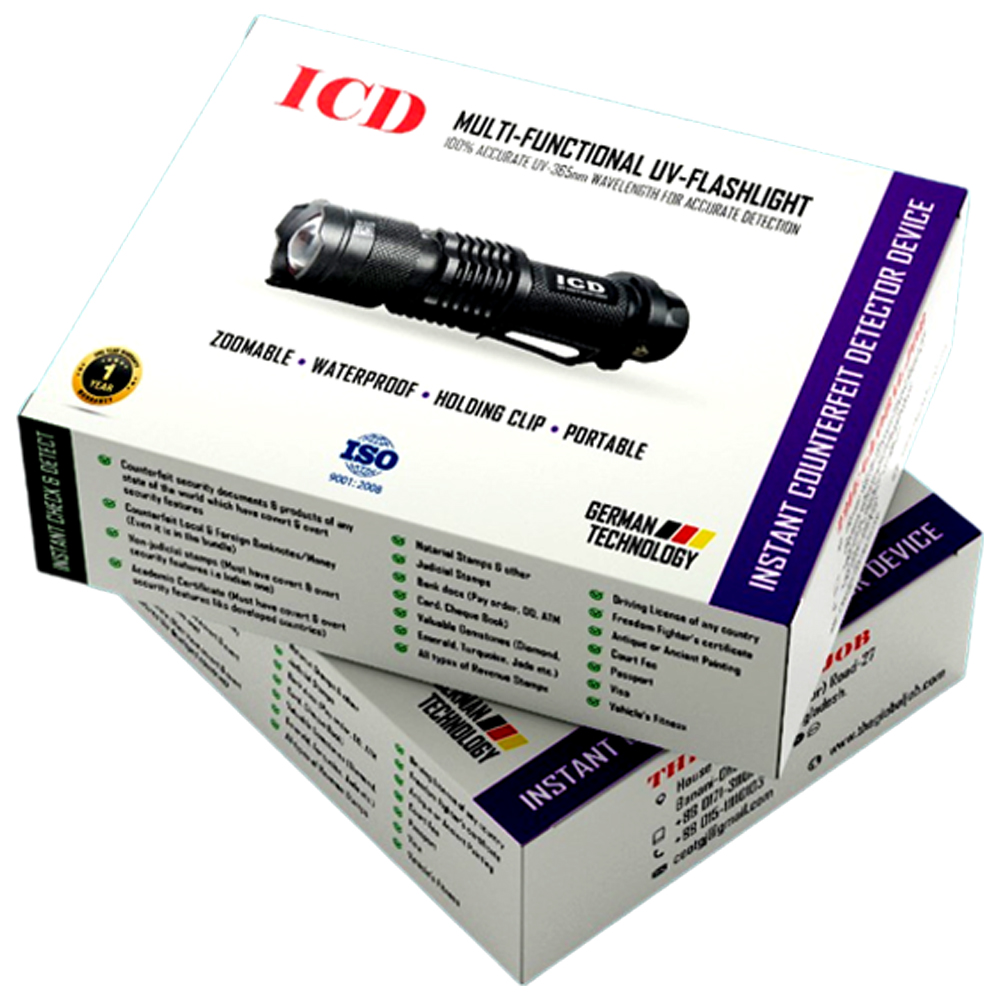ICD Flashlight বাংলাদেশ সহ বিশ্বের সব দেশের যাবতীয় জাতীয় নিরাপত্তা মূলক তথা মূল্যবান রাষ্ট্রীয়,পাবলিক ও বেসরকারি খাতের Documents & Products এর দৃশ্যমান ও অদৃশ্যমান নিরাপত্তা বৈশিষ্ঠ্য ১০০% সুস্পষ্টভাবে মুহূর্তেই উম্মোচিত করে প্রমান করে দেয় কোনটি আসল আর কোনটি জাল বা নকল।